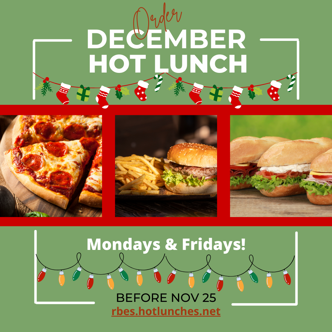 You can now order hot lunch for December! Please double-check our calendar to make sure your child is at school or not on a field trip when you order. Please also note that hot lunch is for Mondays & Fridays.